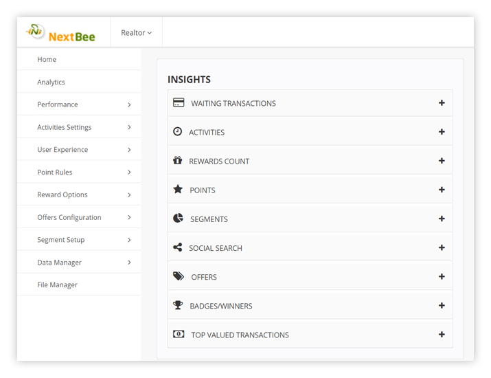 The NextBee platform comes with k-means clustering, segmentation, both logistic and linear regression algorithms that predict user behavior, help you create industry and locale specific customer references and build optimization strategies for reward rules.
